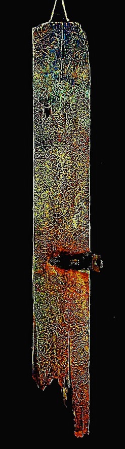 Drew Wood, Golden Mold, oil, color-shifting enamel, acrylic, and synthetic resin on found wooden cabinet with hinge from a barn in Missouri, 4"x28.5"x1", Lydia Hao Collection | Drew Wood Art | Drew Wood