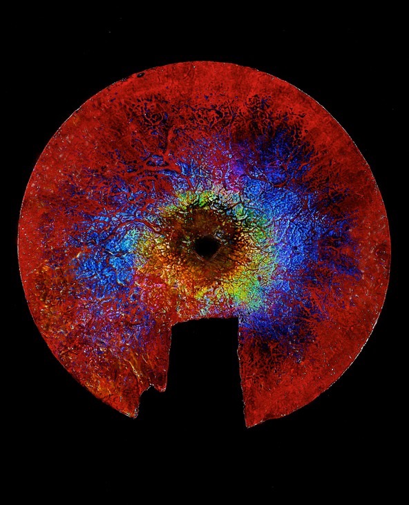 Drew Wood, Insomnia 1, color-shifting enamel, acrylic, and synthetic resin on a found concave iron plow disc from a Missouri farm, radius 8", Lydia Hao Collection | Drew Wood Art | Drew Wood
