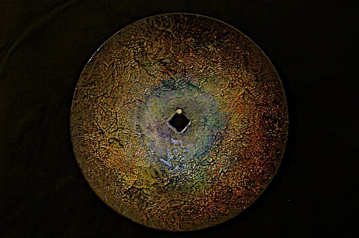 Drew Wood, Insomnia 3, color-shifting enamel, acrylic, pumice, and synthetic resin on a found concave iron plow disc from a Missouri farm, radius 8", Lydia Hao Collection | Drew Wood Art | Drew Wood