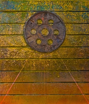 Drew Wood, Karma, color-shifting enamel, acrylic, found iron gear from Missouri farm, and synthetic resin on found wood, 36"x48"x1", nfs | Drew Wood Art | Drew Wood